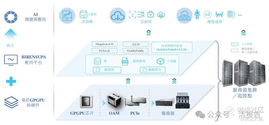 BIRENSUPA-软件平台:公司基于GPGPU的硬件使用其自主开发的软件平台BIRENSUPA运行,其乃搭建于公司GPGPU之上的软件栈,用于开发人工智能应用程序。公司的BIRENSUPA软件平台采用分层架构(即驱动程序、库、编程平台、机器学习框架、解决方案),旨在优化性能、提高开发效率并支持广泛的人工智能应用。