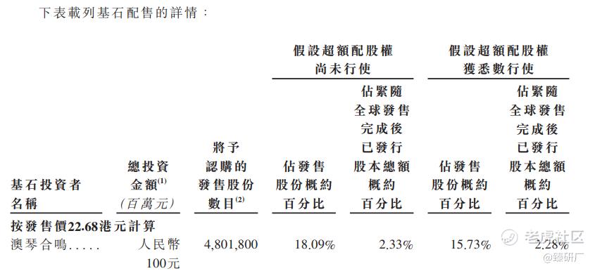 本次发行拥有1名基石投资者,为澳琴合鸣合计认购1.09亿港元,按发售价每股22.68港元,基石投资者认购的发售股份总数为4,801,800股,约占根据全球发售发行的发售股份的18.09%,(假设超额配股权未获行使)。该基石投资者是由东融一号与横琴产业投资基金控股,横琴产业投资基金历史作为基石的项目有健康之路等项目。