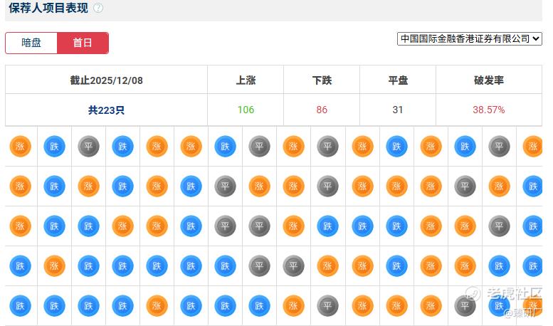 中金公司历史上作为保荐人共参与223个项目,暗盘102家公司上涨,95家公司下跌,26家公司平盘,破发率为42.60%;上市首日106家公司上涨,86家公司下跌,31家公司平盘,破发率38.57%。