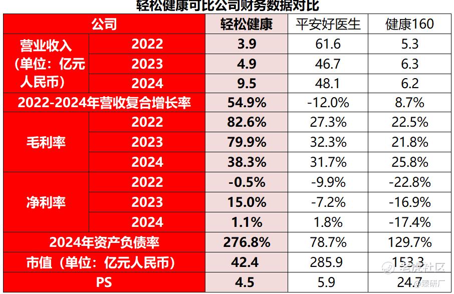 从估值方面来看,轻松健康在市值方面与可比公司中还有明显差距,估值仅42.4亿元,远低于平安好医生的285.9亿元(依托较大的业务规模与市场认知度)、以及健康160的153.3亿元,并且轻松健康2024年资产负债率高达276.8%,显著高于平安好医生的78.7%与健康160的129.7%,这一高负债状态直接制约了其市值的溢价空间。轻松健康 4.5 倍的 PS 估值远低于持续亏损的健康 160(24.7 )、略低于成熟巨头平安好医生(5.9 ),这一定价既体现了市场对其的高度的认可,也反映出该公司相较于可比公司拥有更高的增长潜力。目前轻松健康的核心优势在于54.9%的营收复合增长率领先于同行,若后续能通过优化服务成本结构稳定毛利率、逐步降低资产负债率减轻财务压力,并进一步拓展高毛利的健康服务细分场景,其业务的成长性有望转化为核心竞争力的提升,进而打开市场价值的上升空间。