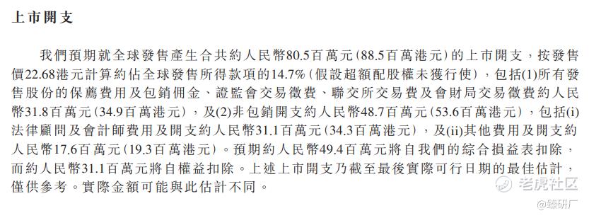 按发售价22.68港元计算,公司上市总支出预计约为8,850万港元、约占所得款项总额的 14.7%(假设未行使超额配售权)。预计约4,994万港元将在综合损益表中扣除,约3,110万港元将在上市后于权益中扣除。