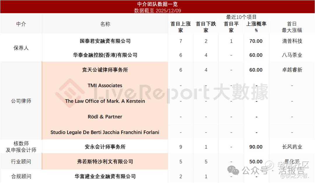 据**大数据统计,卧安机器人中介团队共计10家,其中保荐人2家,近10家保荐项目数据表现普通;公司律师共计5家,综合项目数据表现有待加强。整体而言中介团队历史数据表现缺乏亮点。