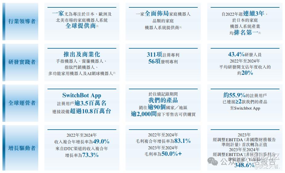 公司产品的品牌名称为SwitchBot及Acemate。公司的用户可以主要通过SwitchBot App随时与产品互动,满足彼等不同家庭生活需求,使公司的产品能够有效实时互动。截至最后实际可行日期,公司的家庭机器人系统产品共有涉及47个SPU的七个产品类别。