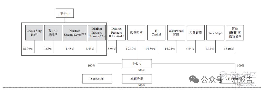 Cheuk Sing Ho持股18.92%、曹少山先生持股1.68%、张向东先生通过Nineteen Seventy-Seven持股1.45%、受限制股份单位计划Distinct Partners I Limited持股4.43%,创始人王志远先生为公司的最终单一最大股东,能够行使合计26.48%的投票权。
