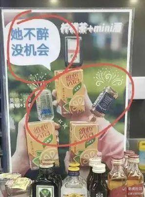 2022年6月,一张印有“她不醉,没机会”字样的7-Eleven便利店广告引发广泛关注和争议。有网友在社交平台上传了一张实拍照片,画面显示店内迷你酒货架上方悬挂的广告牌上赫然写着这句标语,配图则展示了将迷你酒倒入柠檬茶中的场景。