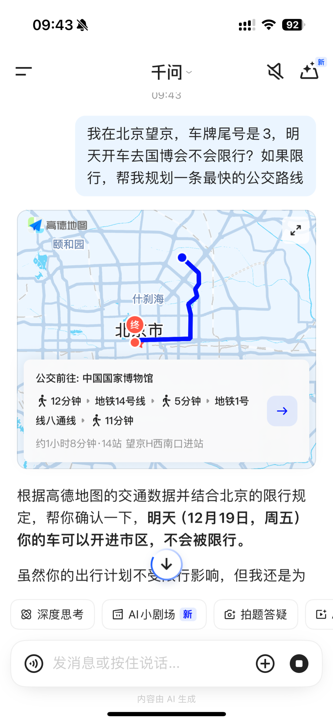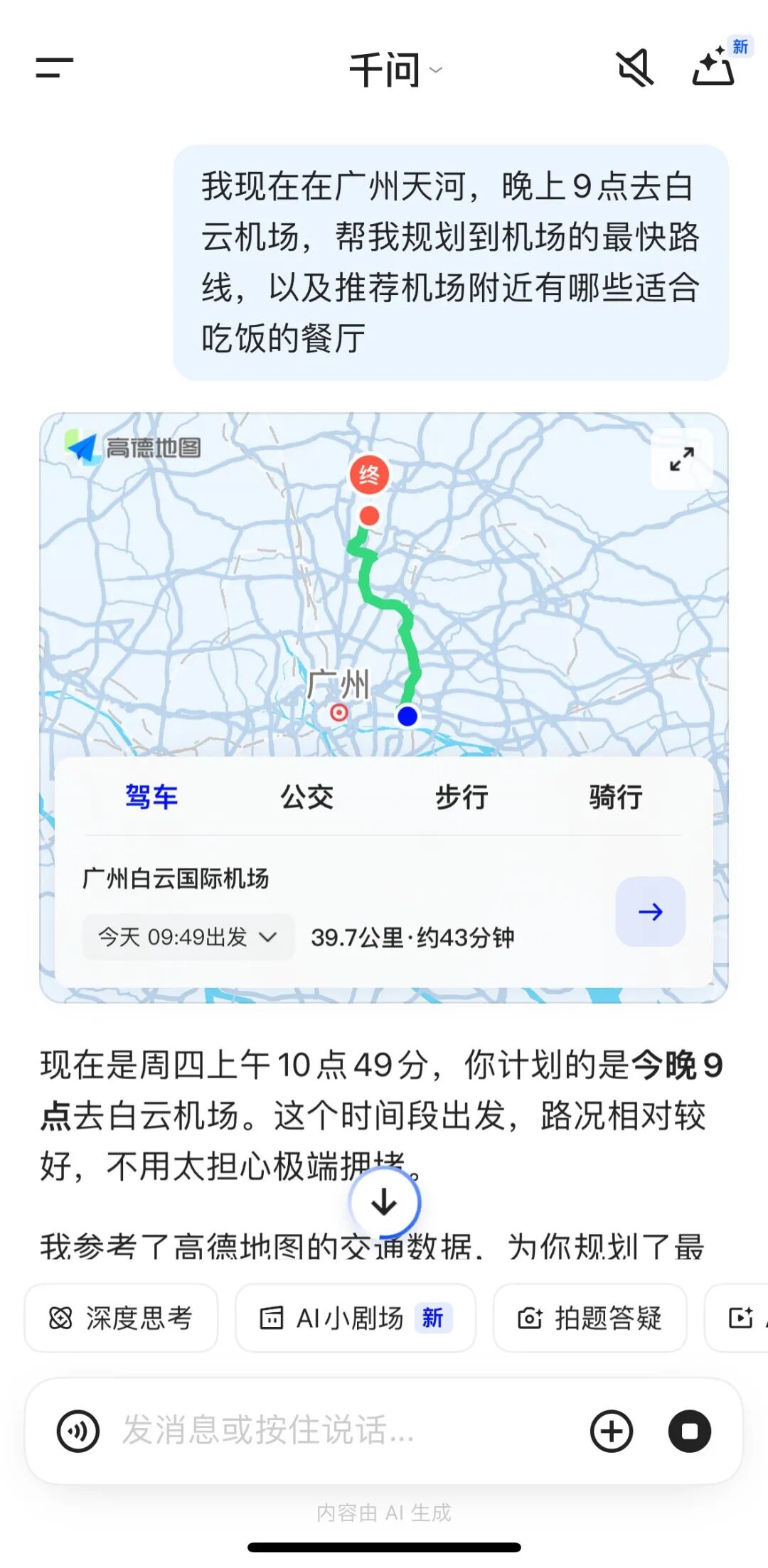 比如,询问出行线路,千问可以直接给出行的导航地图,不用再手动打开其他app。