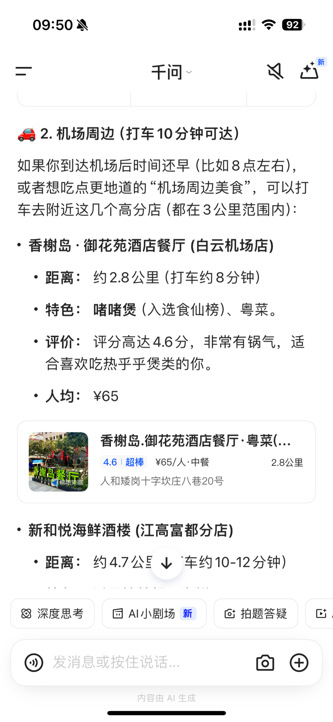 再比如,千问也可以同时处理导航和餐厅的混合问题,并根据高德扫街榜等的信息给出靠谱的推荐。