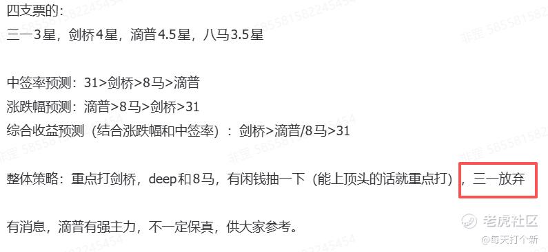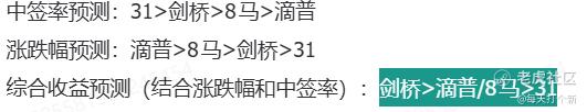 剑桥科技是和八马茶业、滴普科技、三一重工同时上市的,我们的策略是剑桥>滴普/8马>31,最终不论是中签率,还是涨跌幅,亦或是综合收益,均完美预测。