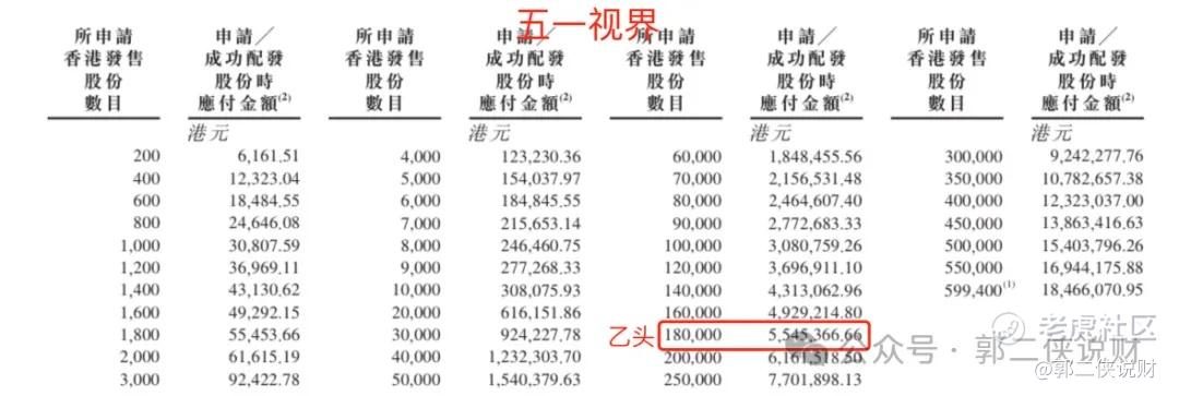 五一视界目前孖展7倍,最终大概率会超购100倍,回拨至20%,甲乙组各11988手。考虑到6家公司同时招股,会分流一部分打新人。申购人数按照8万人算,预估一手中签率5%,甲尾中签1手。