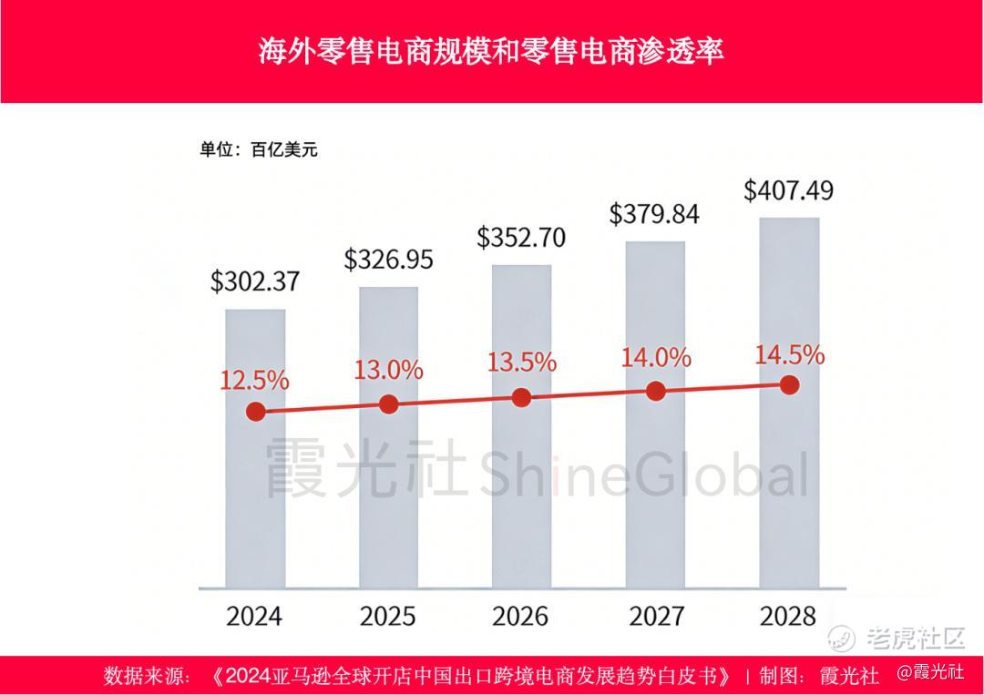 这是一个机遇与挑战并存的时代:一方面,亚马逊发布的《2024亚马逊全球开店中国出口跨境电商发展趋势白皮书》预测,2025年海外零售电商规模将达到3.27万亿美元,渗透率达到13%左右,这两项关键数字将在2028年进一步提升到4.07万亿美元和14.5%,行业增速仍然可观;另一方面,品牌在产品、供应链、全球布局等方面都迎来新的能力升级窗口。