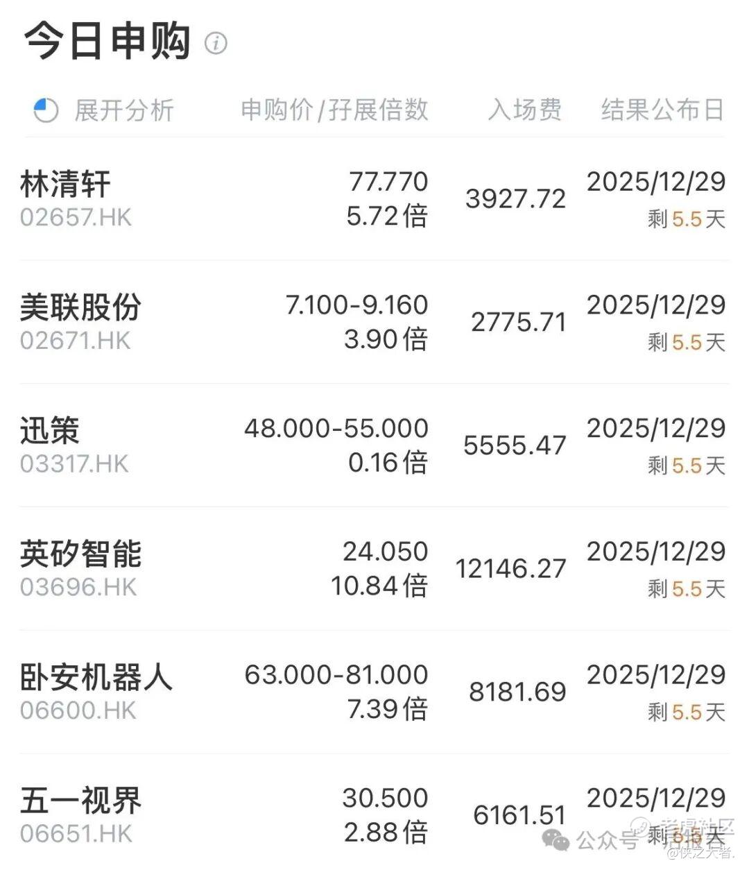 12月18日,六只新股同日开启招股,分别为:卧安机器人(6600.HK)、迅策(3317.HK)、林清轩(2657.HK)、英矽智能 (3696.HK)、五一视界(6651.HK)、美联股份(2671.HK)。