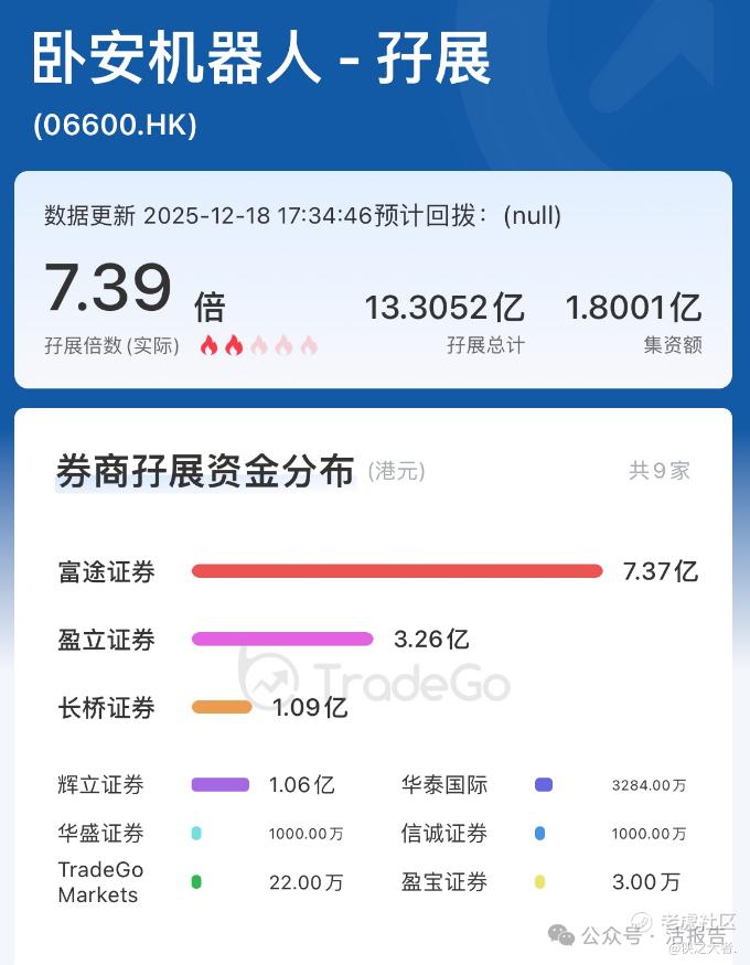 据TradeGo新股孖展数据,截至12月18日17:35,卧安机器人孖展总额已达13.31亿港元,孖展认购倍数约7.39倍,首日认购已足额。其中,富途证券、盈立证券、**证券分别放出7.37亿万、3.26亿、1.09亿港元。
