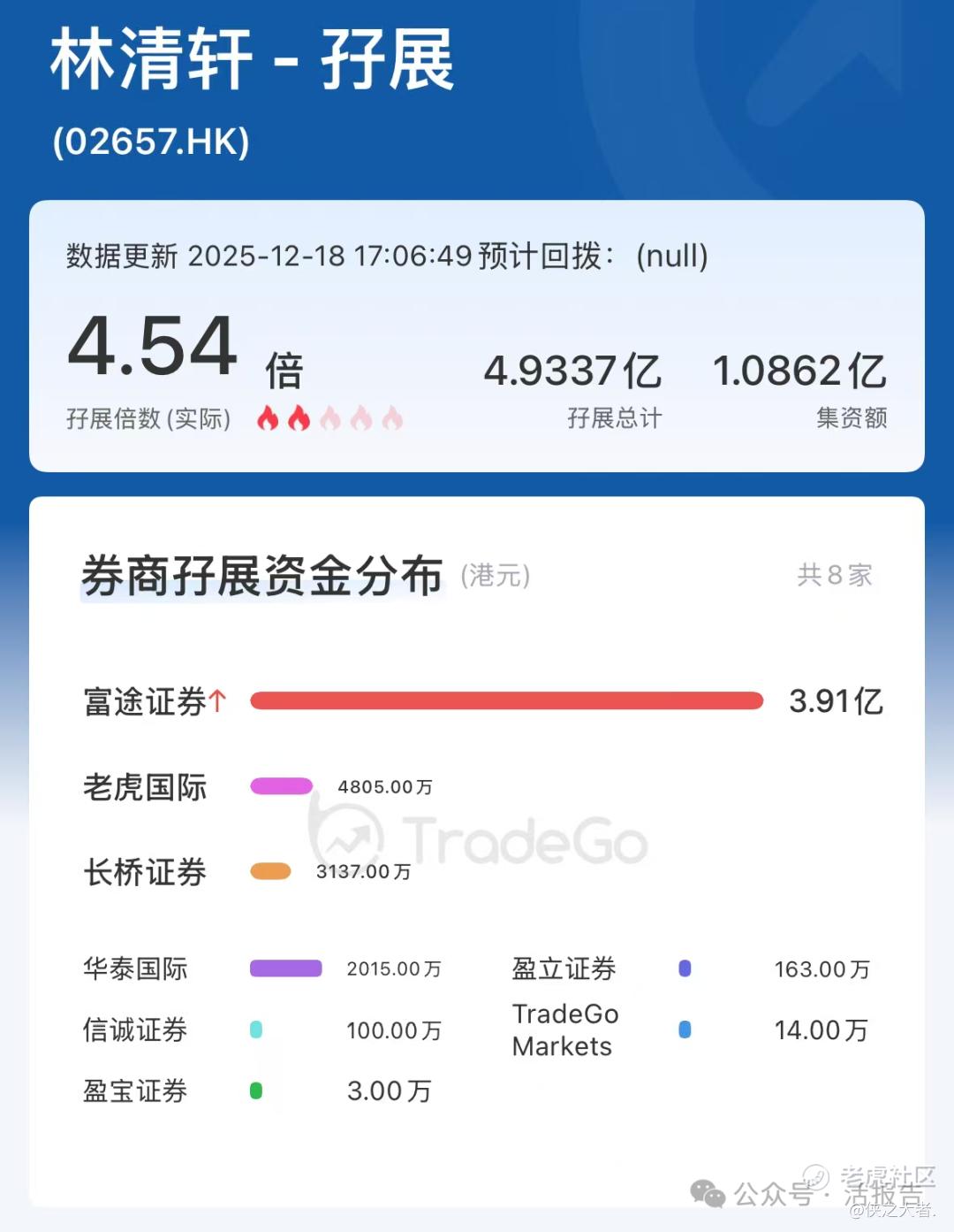 据TradeGo新股孖展数据,截至12月18日17时,林清轩孖展总额已达4.93亿港元,孖展认购倍数约4.54倍,首日认购已足额。其中,富途证券、老虎国际、**证券分别放出3.91亿、4805万、3137万港元。