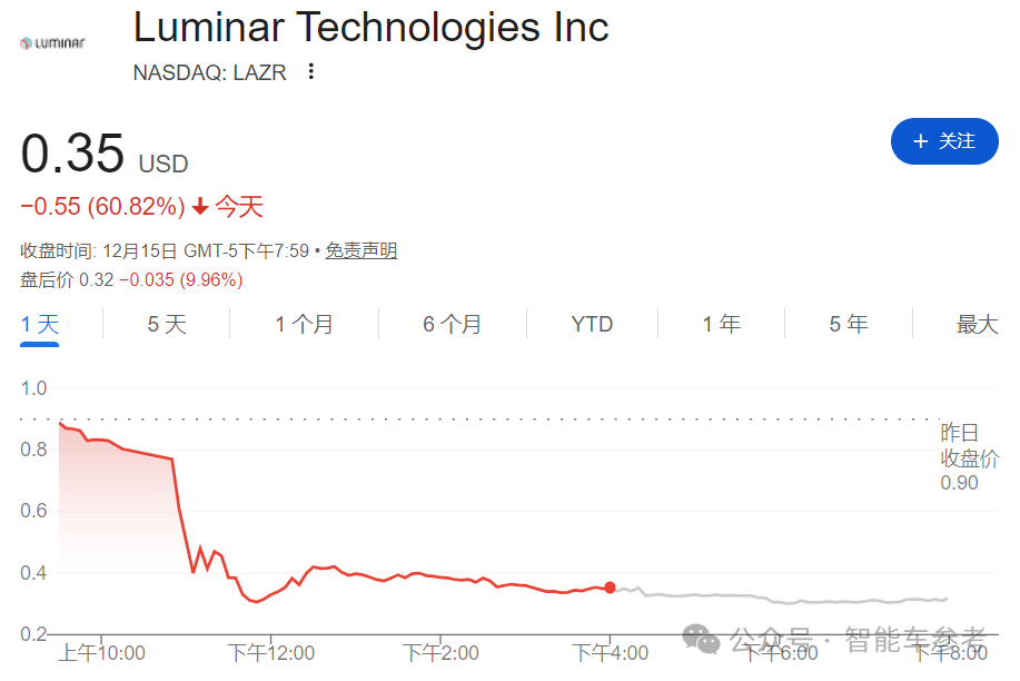 破产消息公布后,Luminar的单日股价暴跌60.8%,收盘价0.353美元/股,最新市值2744.50万美元(约1.93亿元),较巅峰时期已暴跌超99%。