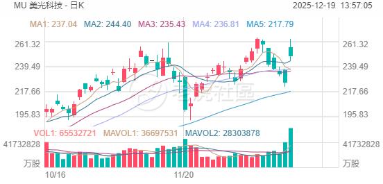美东时间12月19日收盘,美光科技(MU)强势报收$248.55,单日暴涨+10.21%(+$23.03),距离52周高点$264.75仅差6.1%。成交量达6500.61万股,换手率5.78%,显示资金大举涌入。
