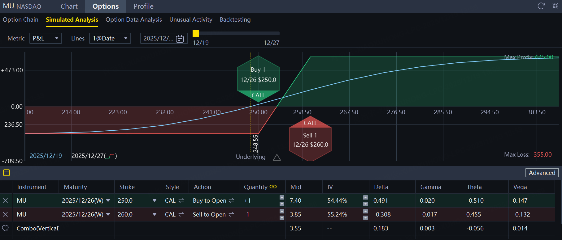 策略逻辑 (Rationale): 在当前强势突破背景下,该策略完美捕捉$250-$260区间的上行收益,同时通过卖出高执行价Call降低成本和Vega风险。盈利条件为股价在到期时高于$253.55即可获利。