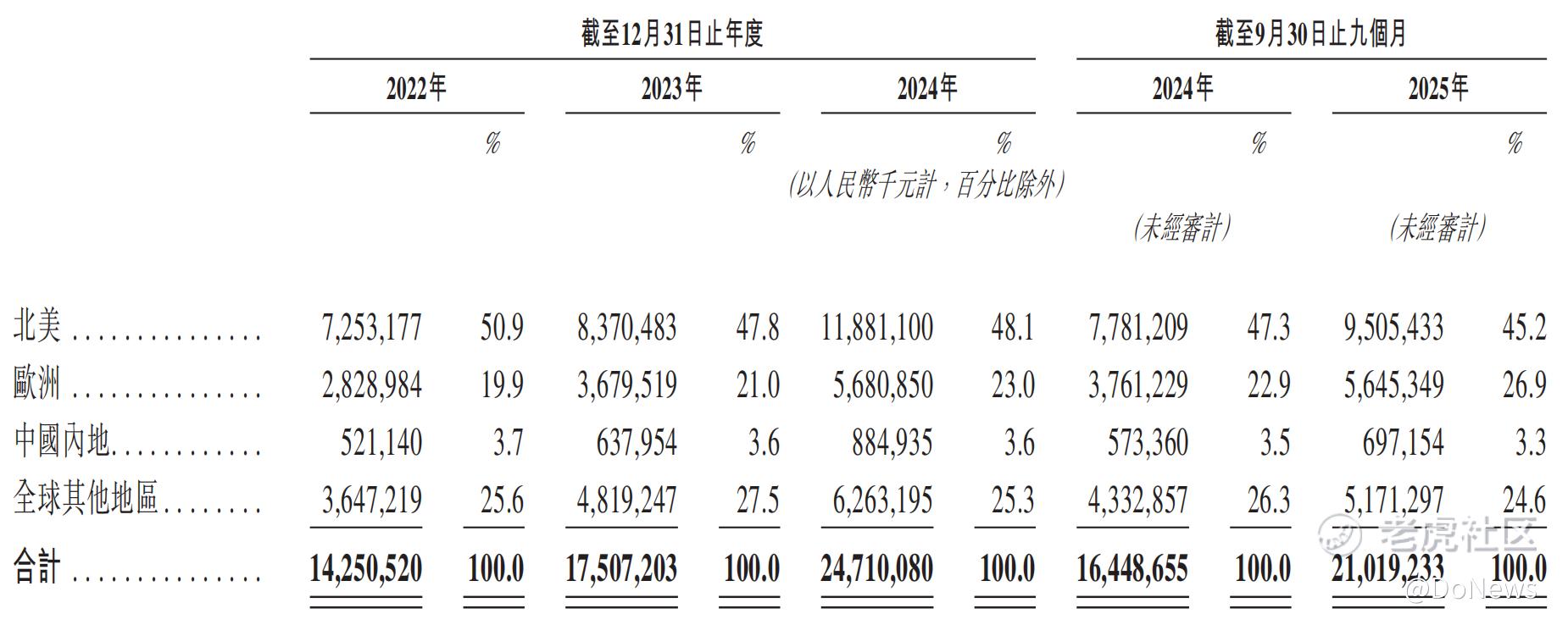 按照地域市场划分,安克创新的大部分营收来自北美及欧洲,2022年至2024年及2025年前三季度,来自北美的收入分别为72.53亿元、83.71亿元、118.81亿元和95.05亿元,占营收的比例分别为50.9%、47.8%、48.1%和45.2%,为第一大营收来源。同一时期,来自欧洲的收入分别为28.29亿元、36.80亿元、56.81亿元和56.45亿元,占营收的比例分别为19.9%、21.0%、23.0%和26.9%。
