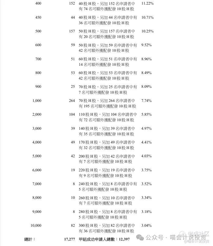 甲组分配:速速降,甲尾单手中签率3.044%(为甲组均值的33%),1000手中签30.44手;一手摸中签率50%。