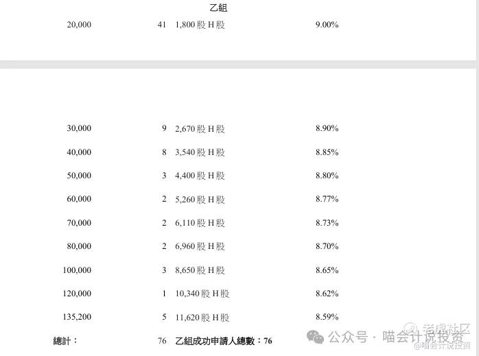 乙组分配:近大通铺,乙头单手中签率9.00%(为乙组均值的1.02倍),2000手中签180手;顶头槌1.35万手中签1162手,单手中签率8.59%。