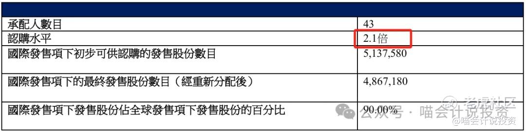 国际发售2.1倍,43名投资者,喵老师追了这个项目挺长时间,曾经到过10-20倍的,很多投资者一看大势不好,纷纷撤单了。