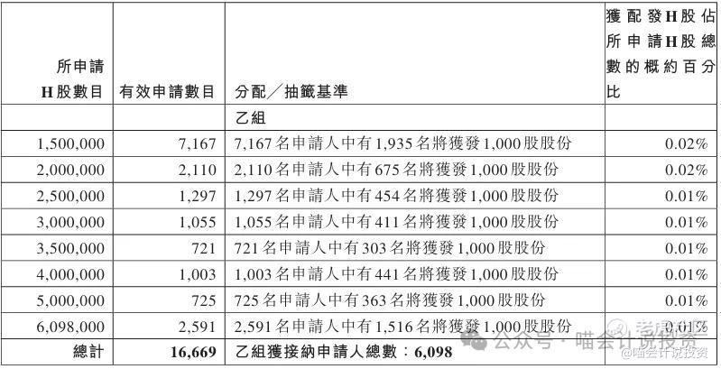 乙组分配:缓降,乙头单手中签率万分之1.80(为乙组均值的1.88倍),1500手中签率27.00%;顶头槌6098手中签率58.51%。
