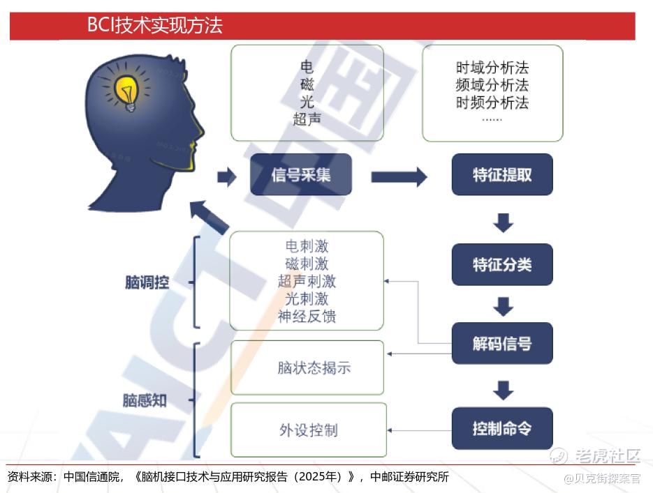 脑机接口系统集成了神经科学、信号处理、计算机科学、人工智能以及电子工程等多种技术,主要由用户(大脑)、脑信号采集、脑信号处理与解码、控制接口、机器人等外设和神经反馈构成,其中核心组成部分为脑信号采集、脑信号处理与解码、控制接口。