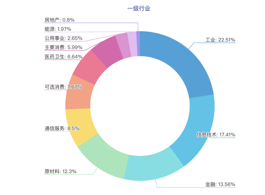 截至12月18日,该指数的前五大权重行业分别为工业(22.51%)、信息技术(17.41%)、金融(13.56%)、原材料(12.3%)、通信服务(8.5%)。