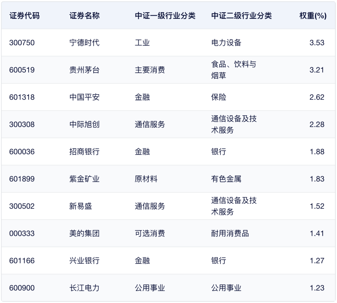 从指数持仓来看,既包括AI产业链“隐形冠军”,又覆盖了新能源龙头,还将传统金融、消费、制造、电力行业的“领头羊”揽入麾下。