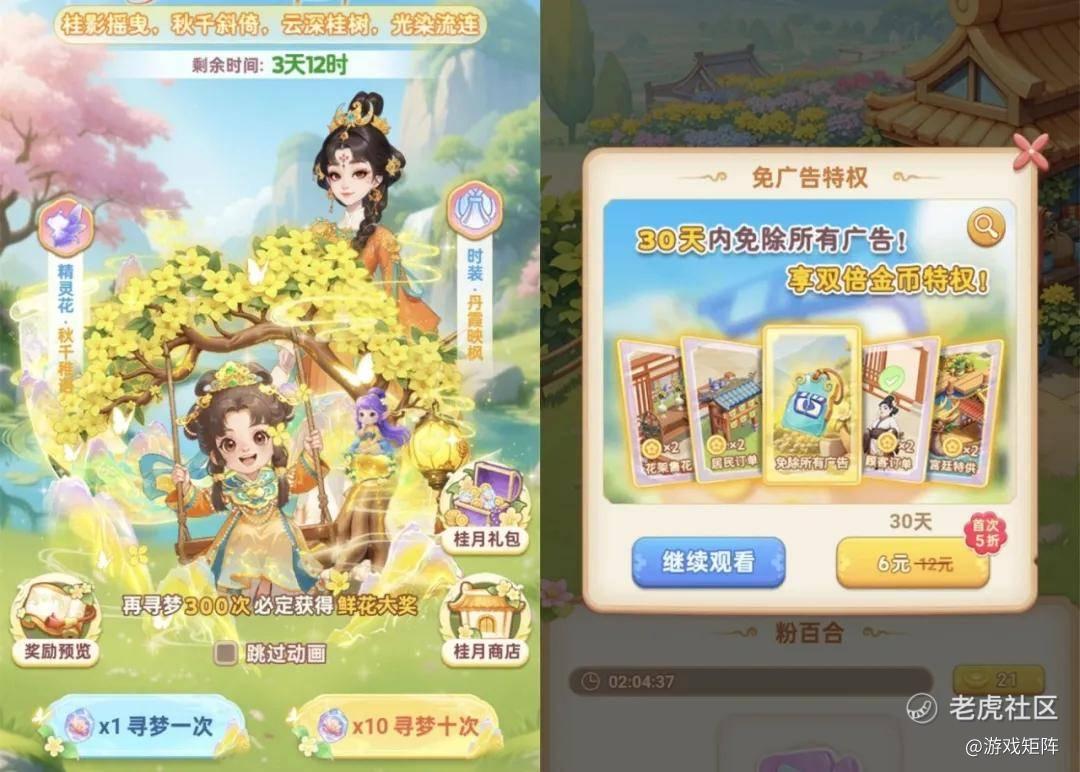 《我的花园世界》从入门的免广告卡、双倍金币卡,到中度的大小月卡、花灵抽卡、成长基金,再到重度的分享集赞、插花排行榜等,分门别类设置了多个付费点位。可以说把Royal Match、Monopoly GO等海外产品验证过的氪金设计精髓都搬了过来。