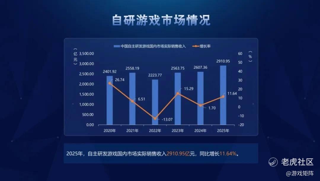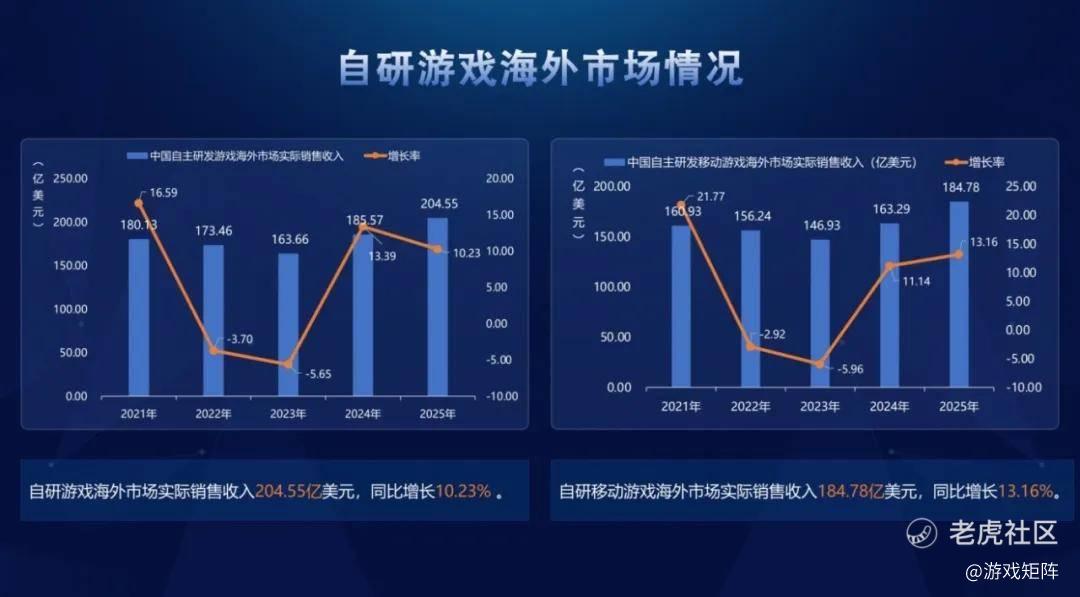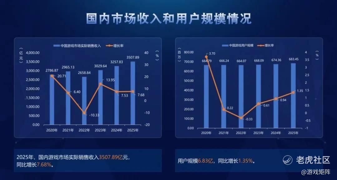 报告显示,2025年,国内游戏市场实际销售收入3507.89亿元,同比增长7.68%;用户规模6.83亿,同比增长1.35%。均为历史新高。自主研发游戏国内市场实际销售收入2910.95亿元,同比增长11.64%。自研游戏海外市场实际销售收入204.55亿美元,同比增长10.23%,其中自研移动游戏海外市场实际销售收入184.78亿美元,同比增长13.16%。