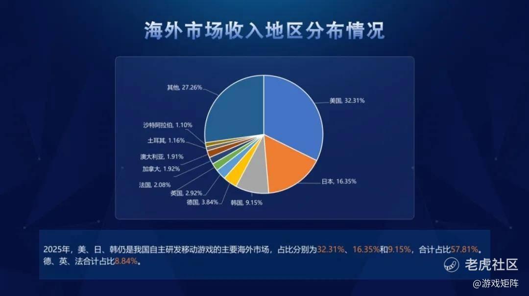 这些建设性的文化内容不仅影响国内玩家审美,也开始影响海外的年轻玩家群体,在潜移默化之中扭转海外对中国的刻板印象。产业年会的数据也支持这一趋势。数据显示,今年中国自研游戏海外市场实际销售收入204.55亿美元,同比增长10.23%,规模已连续六年超千亿元人民币。其中,美、日、韩仍是我国自主研发移动游戏主要海外市场,占比分别为32.31%、16.35%和9.15%,合计占比57.81%。德、英、法合计占比8.84%。