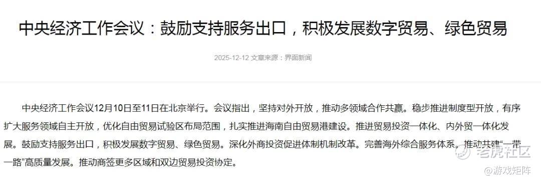 对游戏产业而言,中央经济工作会议等于为游戏产业指明了未来发展的方向。一方面游戏厂商必须不断自我升级,推出更优质的产品和服务满足玩家需求。另一方面,游戏企业需要继续走向海外,将中国产品和中国文化输出海外。而国家有可能给到的支撑就是“有序扩大服务领域自主开放”。