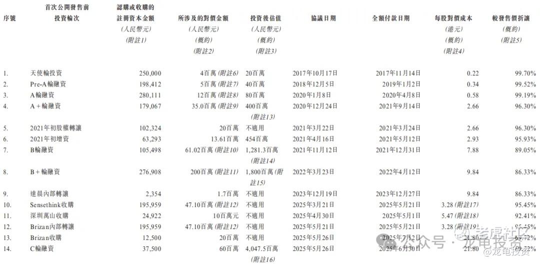 卧安机器人IPO前总共完成14轮增融资,最后C轮融资完成于2025年6月30日,每股成本21.80港元,较发售价折让69.72%,完成融资后估值40.48亿港元;基石方面本次引入9家机构,认购8998万美元,约合7亿港元,按中位数定价占比43.75%。