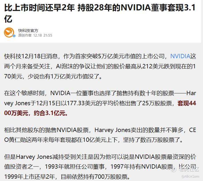 重量级大股东大笔抛售 $英伟达(NVDA)$ 套取现金,这个新闻快要刷屏了,赶紧瞧一瞧,到底是怎么回事。[暗中观察] 看新闻里说的,12月15日英伟达独立董事Harvey Jones以177.33美元的均价,减持了25万股,套现约4400万美元。他减持的股份购于1997年,比这公司1999年上市还早2年,属于“原始级”筹码了。不过,人家减持后仍通过家族信托持有700多万股,对应市值约12亿美元,所以这并非是清仓式撤离。