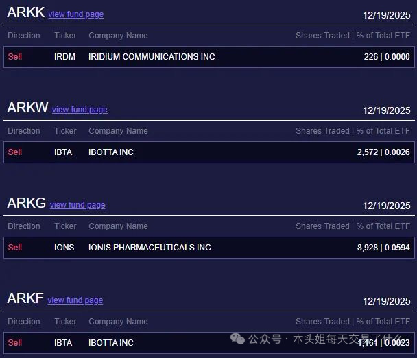 木头姐今天没有买,只有卖!但是这个卖的很敷衍。卖出3000美金IRDM,这个跟特朗普的太空政策是相辅相成的,昨晚也涨。卖出7.5万美金IBTA、70万美元IONS。这加起来都没有破百,很像实习生拿来练手的。