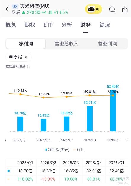 这成绩单,几乎是把“AI 存储超级周期”写在了脸上啊。[鬼脸] 基本面强,估值不离谱,周期向上,美光这个Q1财报与Q2指引已把“AI+HBM 驱动的盈利拐点”坐实,2026 年盈利与自由现金流有望继续创新高, 不过我觉得,MU短线涨幅过快,逢回调分批买入+期权增强, 应该是当前更优解,而非一口气追高。给一点时间让市场消化“惊喜指引”,往往能拿到更好的风险回报。[财迷]