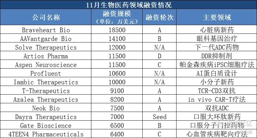 前沿技术路线与新靶点受到关注:11月,诺奖得主创办的in vivo CAR-T药物公司Azalea、分子胶公司Quarry Thera、分子门控药物公司Gate Bio等前沿技术企业均获得大额融资。