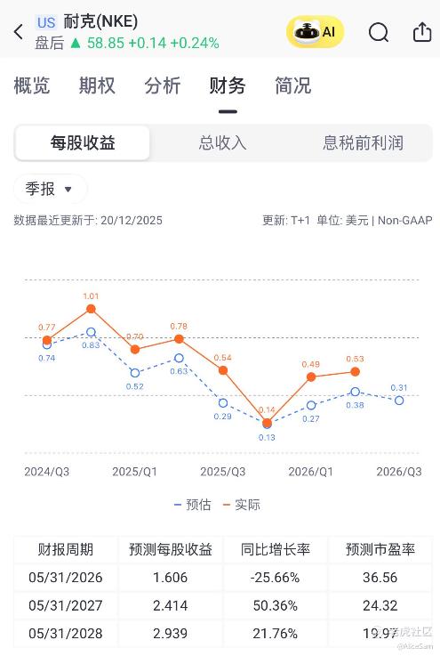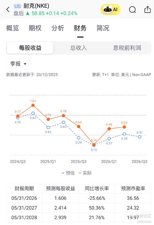 再看看EPS表现,这个季度Nike的稀释后每股收益为 0.53 美元,跟去年同期相比,下降了 32%。从下面这个季度对比图看,他们下个季度的EPS预期为0.31,有点过于悲观了。