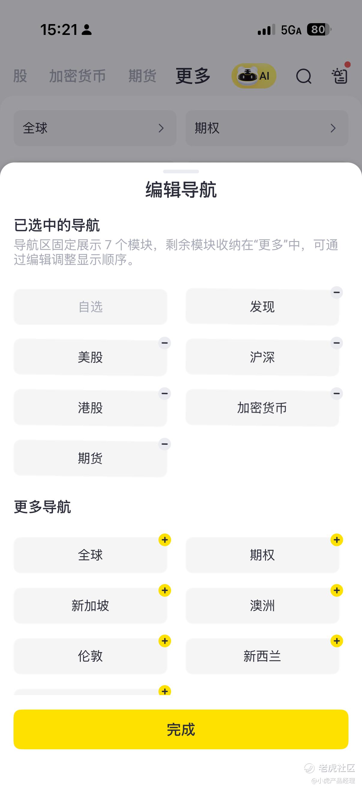 优化了导航层级 取消了原来股票下面的三级导航 全部升级为二级导航 采用固定7个模块(可自定义顺序)+1更多页面的展示 提升浏览效率 减少到达目标页面的点击次数