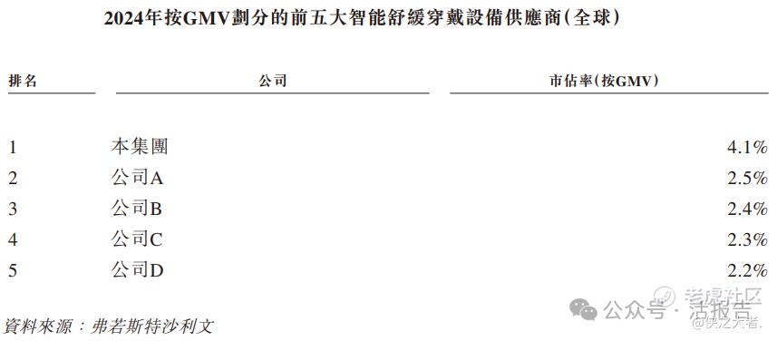 根据弗若斯特沙利文的资料,按GMV计算,公司在中国智能舒缓穿戴设备行业位列国内企业之首,于2024年**国国内市场份额达21.5%。