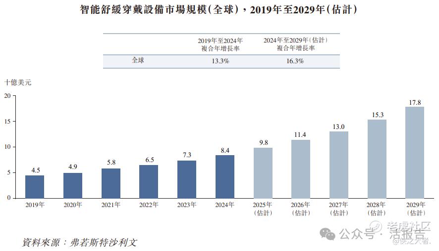 根据弗若斯特沙利文(Frost & Sullivan)的报告,2019年全球智能舒缓穿戴设备市场规模达45亿美元,到2024年达84亿美元,2019年至2024年的复合年增长率为13.3%。预计2029年全球智能舒缓穿戴设备市场规模将达178亿美元,2024年至2029年的复合年增长率为16.3%。