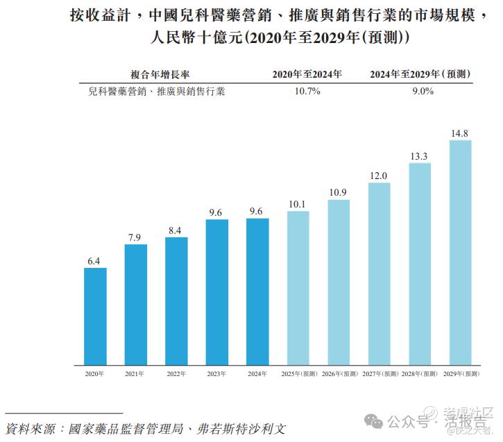 根据弗若斯特沙利文(Frost & Sullivan)的报告,按收益计,中国儿科医药营销、推广与销售行业的市场规模从2020年的人民币64亿元增至2024年的人民币96亿元,复合年增长率为10.7%,预计至2029年市场规模将达人民币148亿元,2024至2029年的复合年增长率将为9.0%。