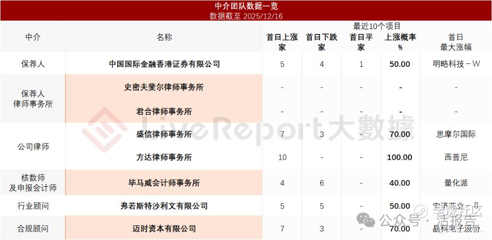 据**大数据统计,科郦中介团队共计8家,其中保荐人1家,近10家保荐项目数据表现不理想;公司律师共计2家,综合项目数据表现良好。整体而言中介团队历史数据表现普通。