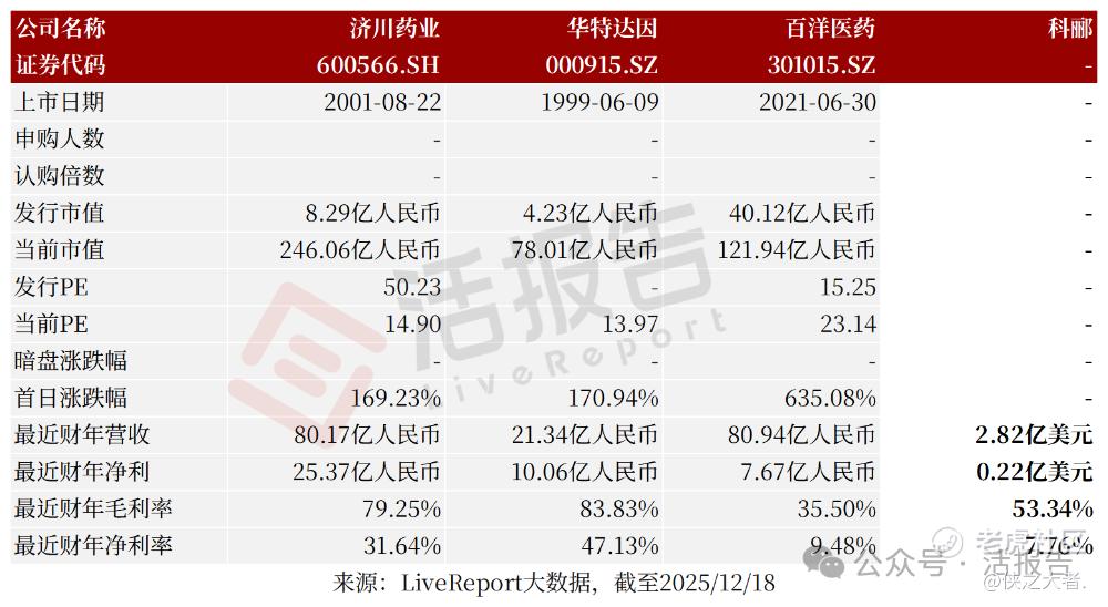 同行业IPO可比公司:济川药业、华特达因、百洋医药