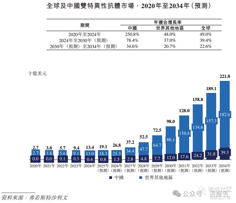 根据弗若斯特沙利文(Frost & Sullivan)的报告,全球双特异性抗体药物市场由2020年的27亿美元增至2024年的134亿美元,年复合增长率为49.0%,;预计到2030年将达到980亿美元,年复合增长率为39.4%;预计到2034年将达到2,218亿美元,2030年至2034年的年复合增长率为22.6%。
