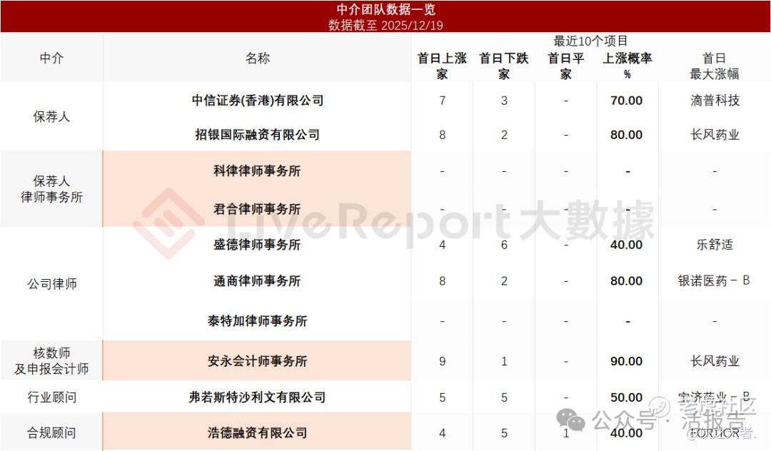 据**大数据统计,岸迈生物中介团队共计10家,其中保荐人2家,近10家保荐项目数据表现尚可;公司律师共计3家,综合项目数据表现有待提升。整体而言中介团队历史数据表现普通。