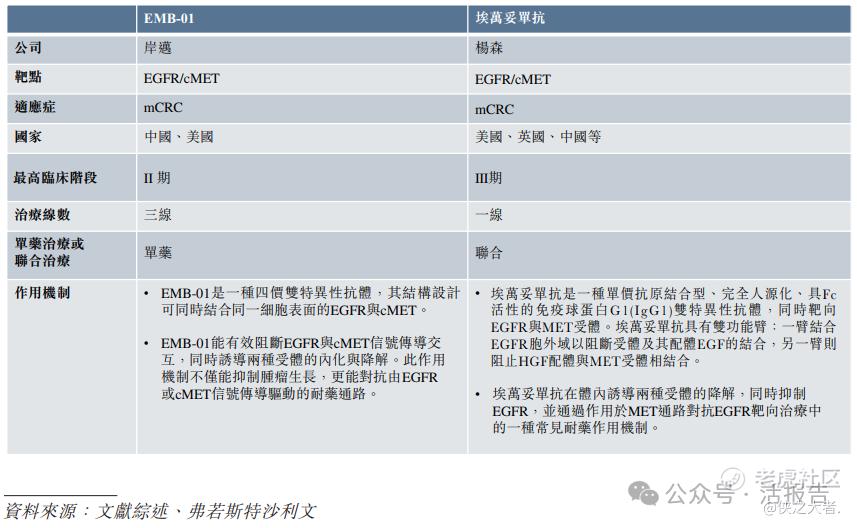 截至最后实际可行日期,由杨森研发的埃万妥单抗是全球首款上市的EGFR/cMET双特异性抗体,已获批用于治疗NSCLC,目前正处于CRC的Ⅲ期临床开发的领先阶段。EMB-01是全球最早进入CRC Ⅱ期临床试验的EGFR/cMET双特异性抗体之一。