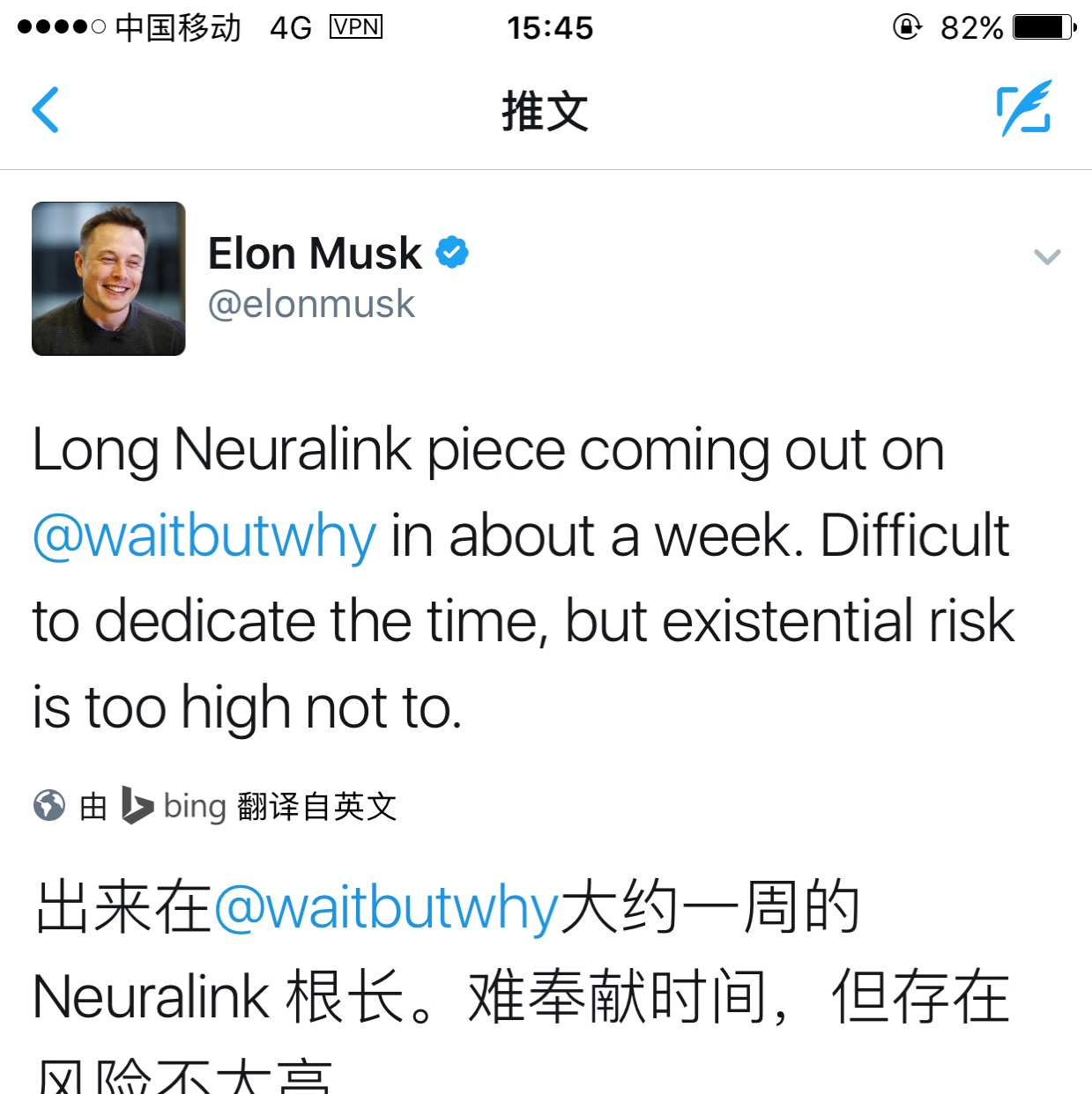 Nueralink 是musk新成立的一家公司做神经花边技术的,研究人脑和机器链接。他说一周后即将发布产品了。