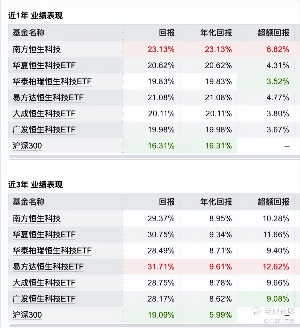 ETF规模超百亿的5只基金中,从近1年回报率角度来看,恒生科技ETF南方(520570)回报23.13%,较沪深300取得了6.82%超额回报;近3年表现来看,恒生科技ETF易方达(513010)回报为31.71%,较沪深300取得12.62%超额回报。3年角度来看,南方、华夏、易方达对沪深300的超额回报均超过了10%。