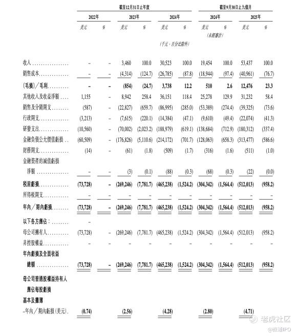 报告期内,MiniMax的收入分别约0、346.0万、3052.3万、5343.7万美元;毛利分别约0、-85.4万、373.8万、1247.6万美元,毛利率分别为不适用、-24.7%、12.2%、23.3%;净亏损分别约7372.8万、2.69亿、4.65亿、5.12亿美元,经调整净亏损分别约1215.0万、8907.4万、2.44亿、1.86亿美元。